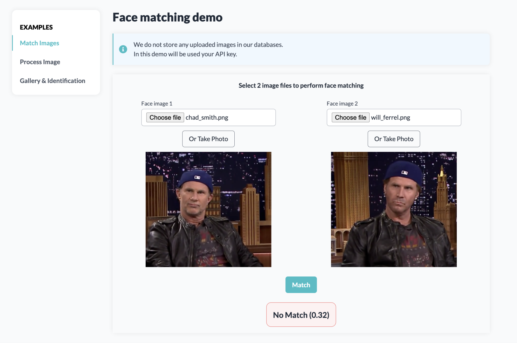 In this case, you want to validate if two face images belong to the same person. This can be done under the Match Images section.